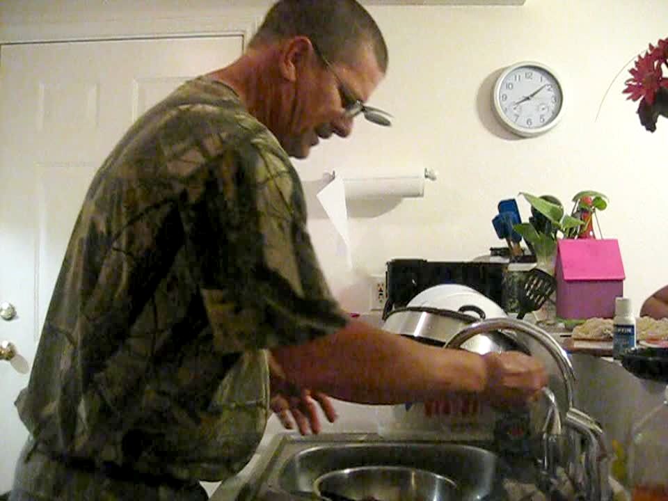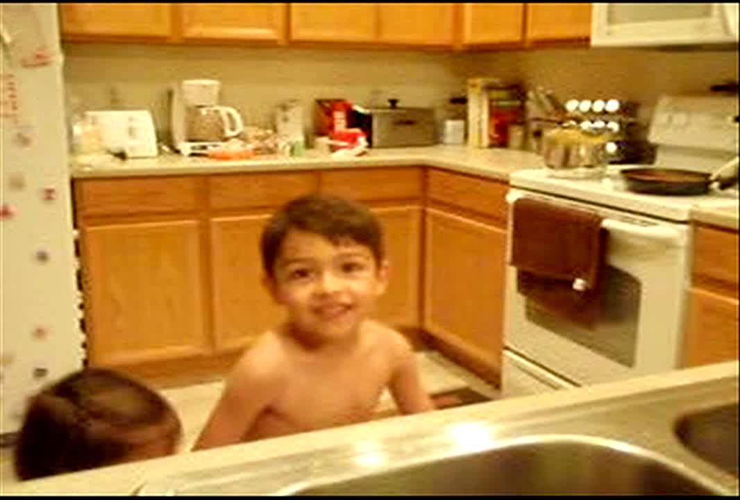 Little boy gets sprayed by kitchen sink rigged by his dad. Spray faucet. Practical joke.