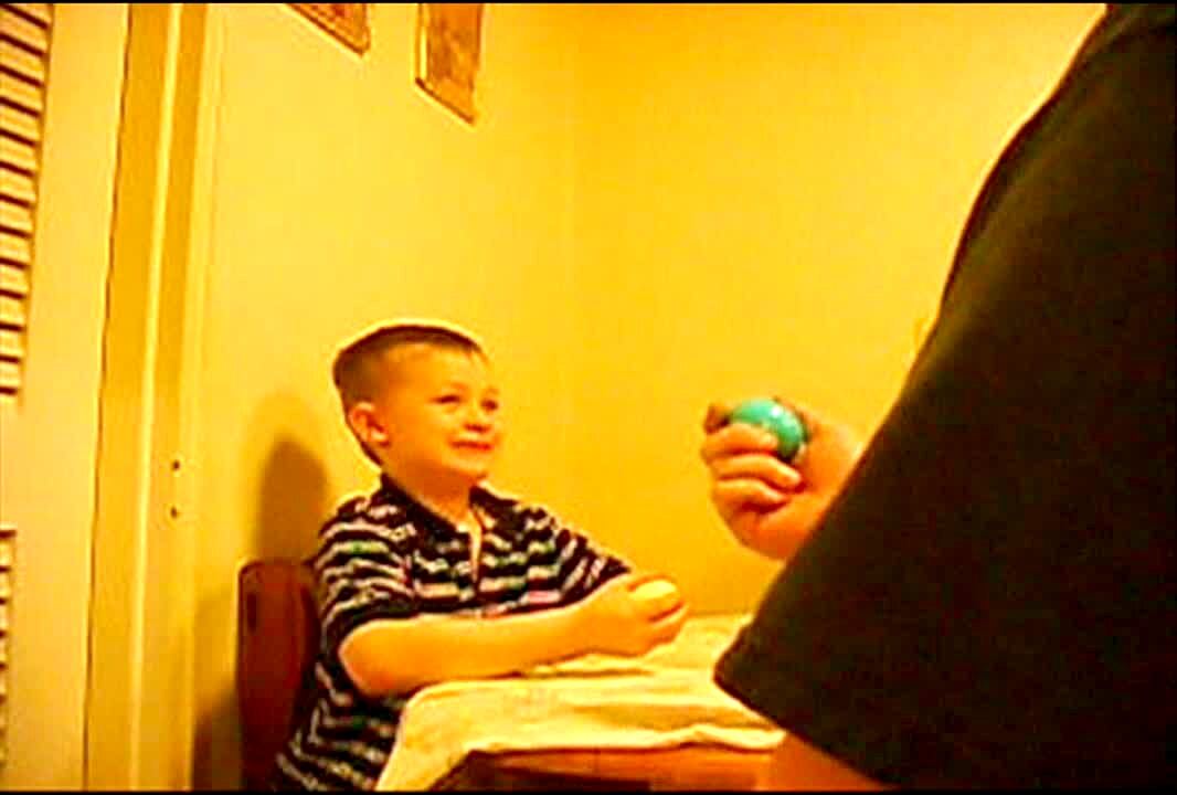 Boy watches dad hit a normal easter egg on his head. Boy's egg is raw when he hits it on his own scalp. Practical joke / prank