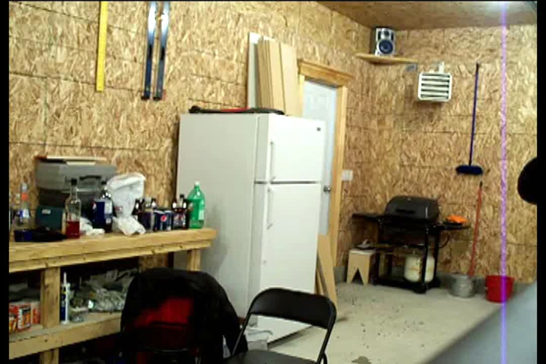 Practical joke; a drunk man walks into a garage. He opens up a refrigerator and man jumps out and scares him.