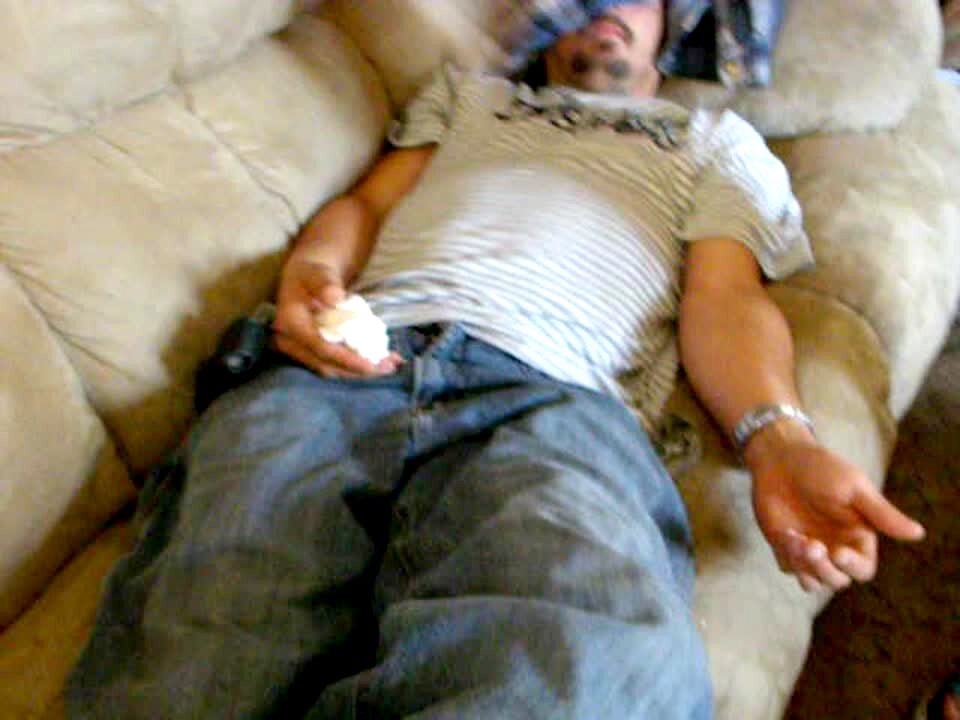 A dad sleeps on a couch in a living room and a mom tells her tot girl to be quiet for him. The girl stands in front of him and screams in his face and wakes him up and he screams.