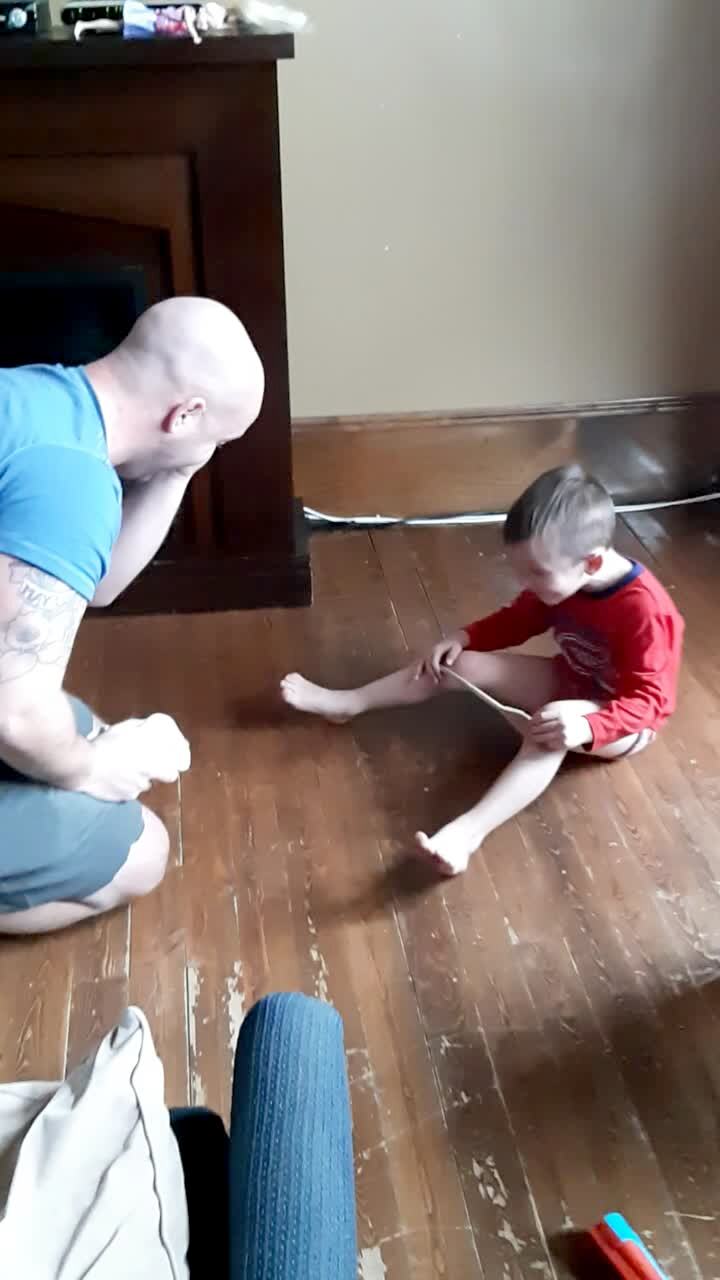 A man plays the invisible string prank on his young son. He pretends to put the string in the boys ear, then when the boy tries to pull it out, hit dad hits him on the side of the head.