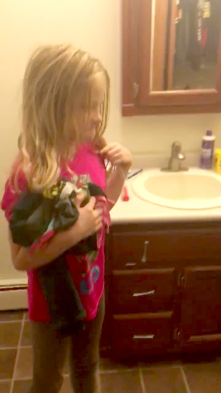 A young girl screams when she walks into the bathroom and sees two creepy young girl statues.