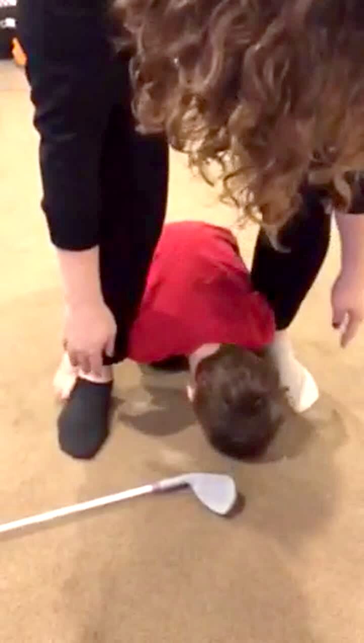 A woman leans out of a moving golf cart to reach her ball on the ground outdoors and falls out.