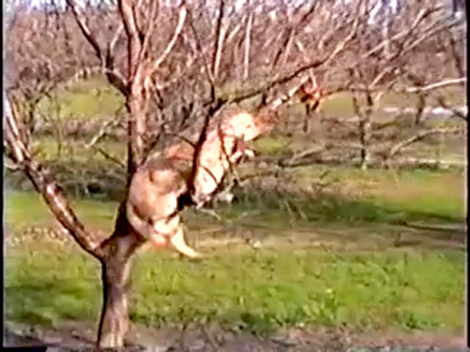 Dog bites and holds onto a tree branch as he twirls his body around and around.