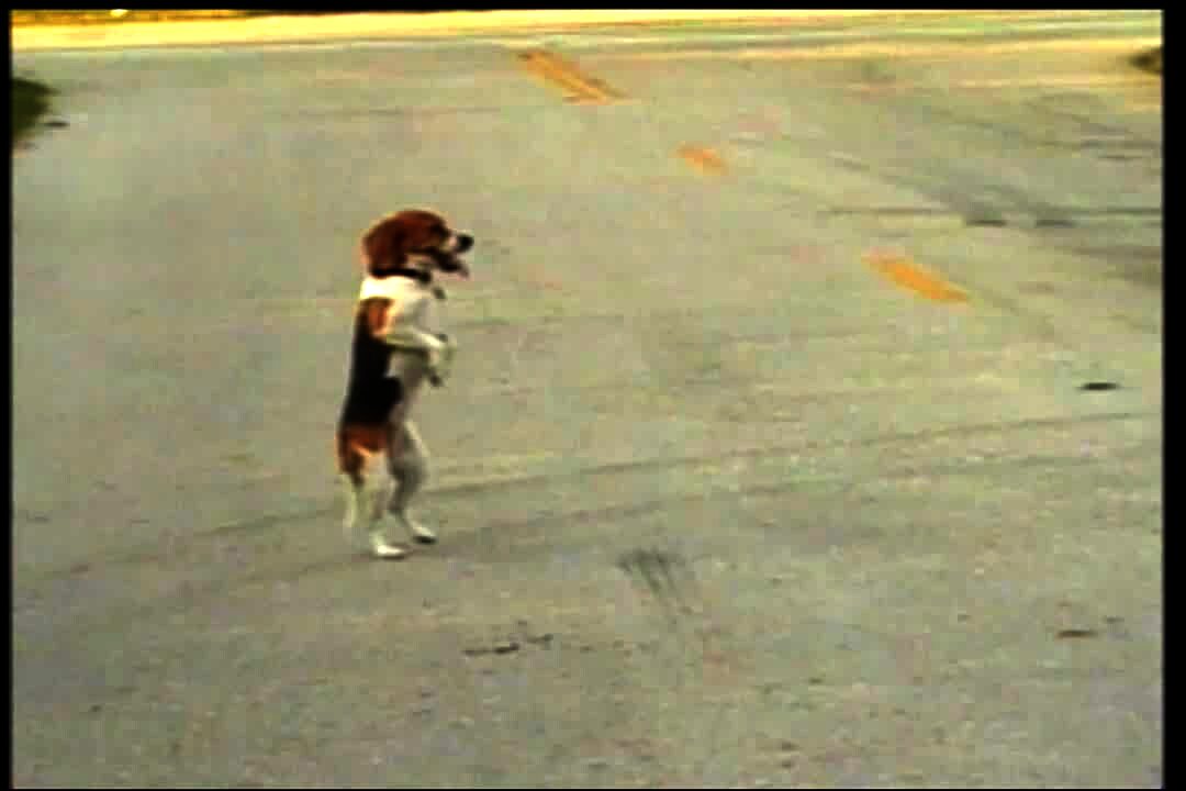 Beagle dog walks on his hind legs all the way to boy. He even stops and looks at a car. Stupid pet trick. Funny image