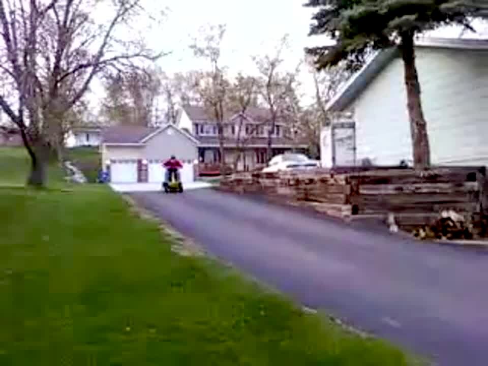 Teen boy chases a car and hits a stop sign. You hear a "bonk" sound as he falls. No tail.