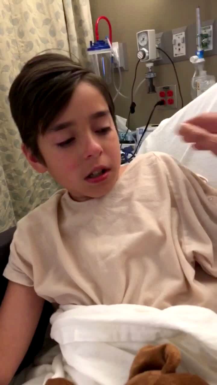 Boy turns on the sink and gets sprayed by a trick faucet that has a taped hose. Practical joke. Kitchen.