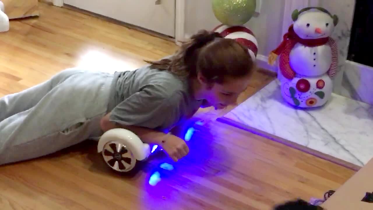 A teen girl lies down on an electric skateboard and rides around her room when her dachshund dog hops on her leg and humps it. hoverboard