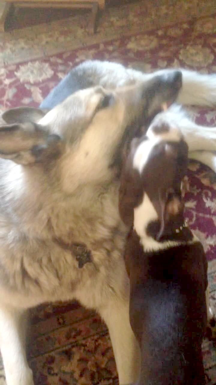 A German Shepherd dog and a Boston terrier dog bite at each others mouths indoors before the German Shepherd dog gets the Boston terrier's head in his mouth.