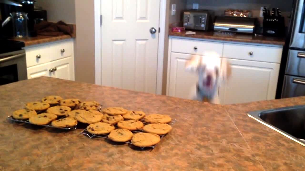 A dog jumps repeatedly indoors behind a kitchen counter because cookies are cooling on racks on the counter.