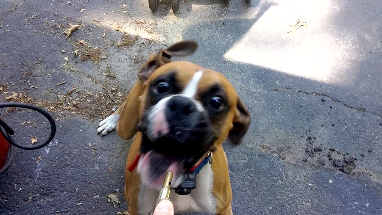 A boxer dog bites at air from an air compressor outdoors.