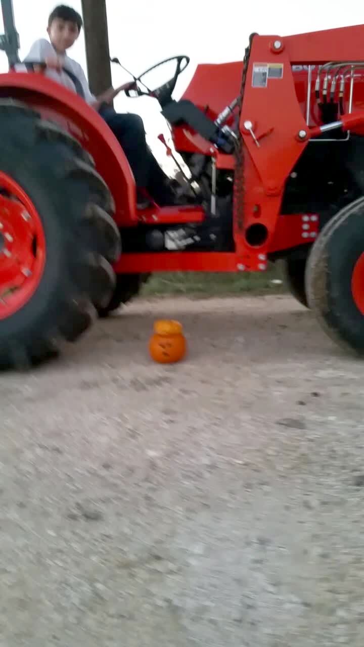 A boy drives a tractor over a pumpkin Jack-o-lantern and crushes it outdoors.