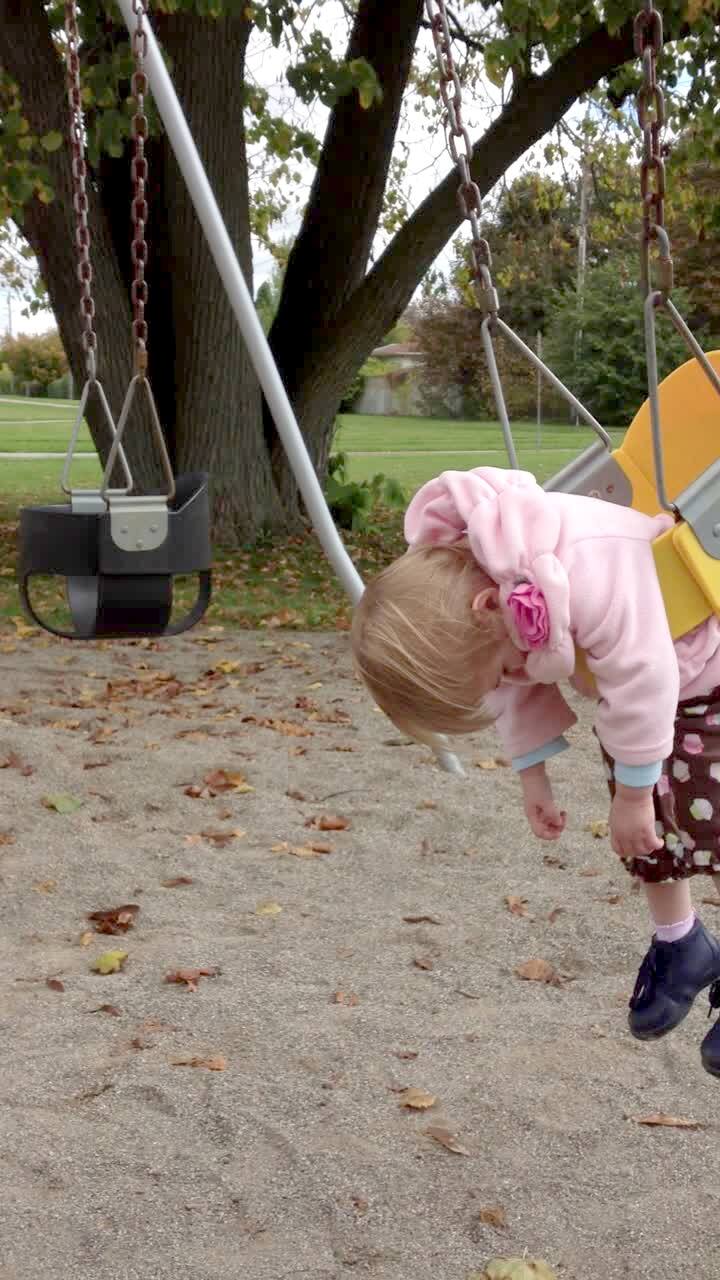 18 month old tot girl is playing in a toy car outside. Mom says turn around and she gets out of the car and spins in circles. Start at 0:25.