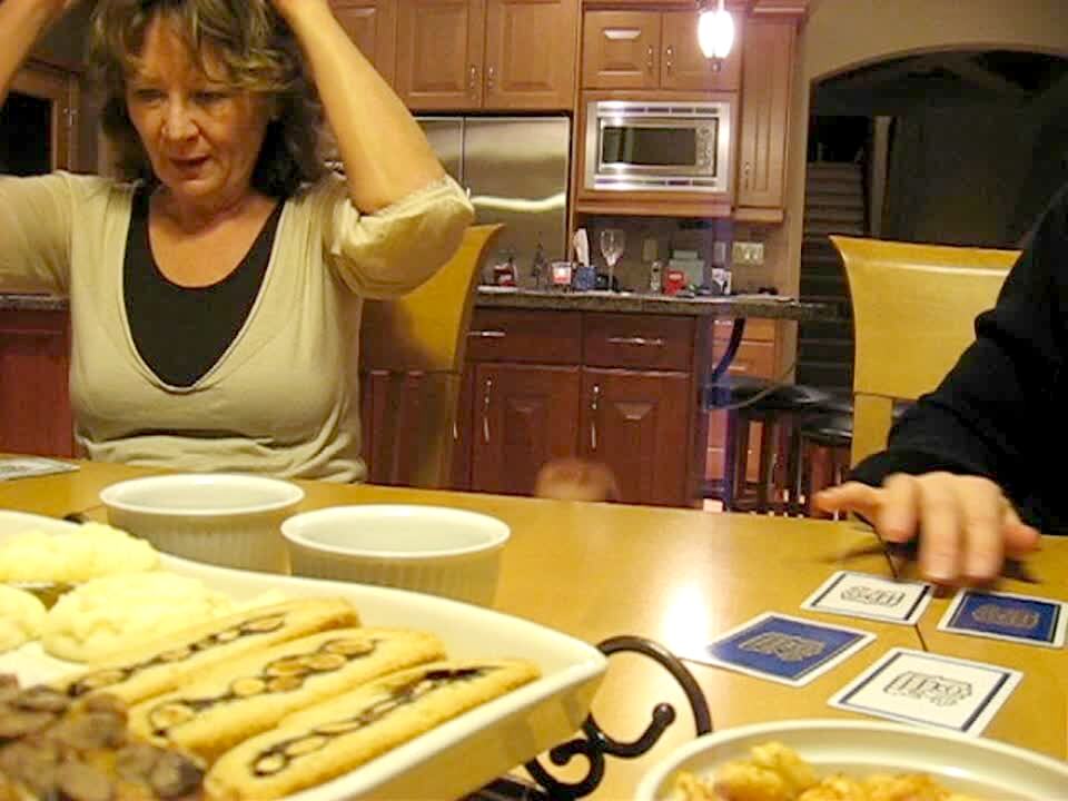 A woman and a young girl play the Pie Face! game at the dining room table. The woman takes her turn, spins the mechanism and avoids the pie slap. The young girl takes her turn, spins the mechanism and the pie is propelled into her face. She immediately starts to cry. Suddenly her younger brother. off-camera, starts to cry as a reaction. Both cry uncontrollably as the woman laughs.