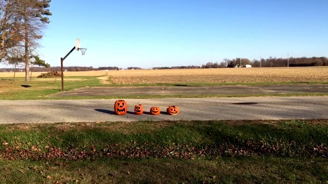 A car runs over a line of four pumpkins outdoors.