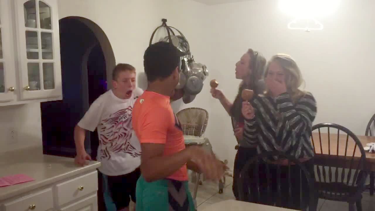 A teen boy runs to jump on a yoga ball outdoors when the ball pops and he falls. Vine/Instagram.