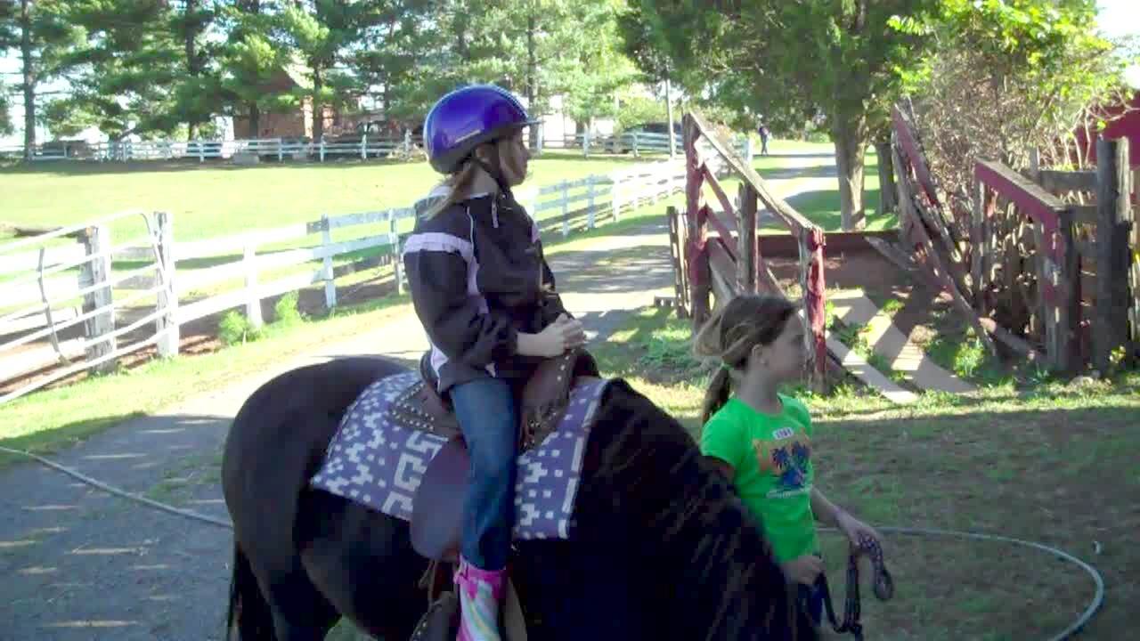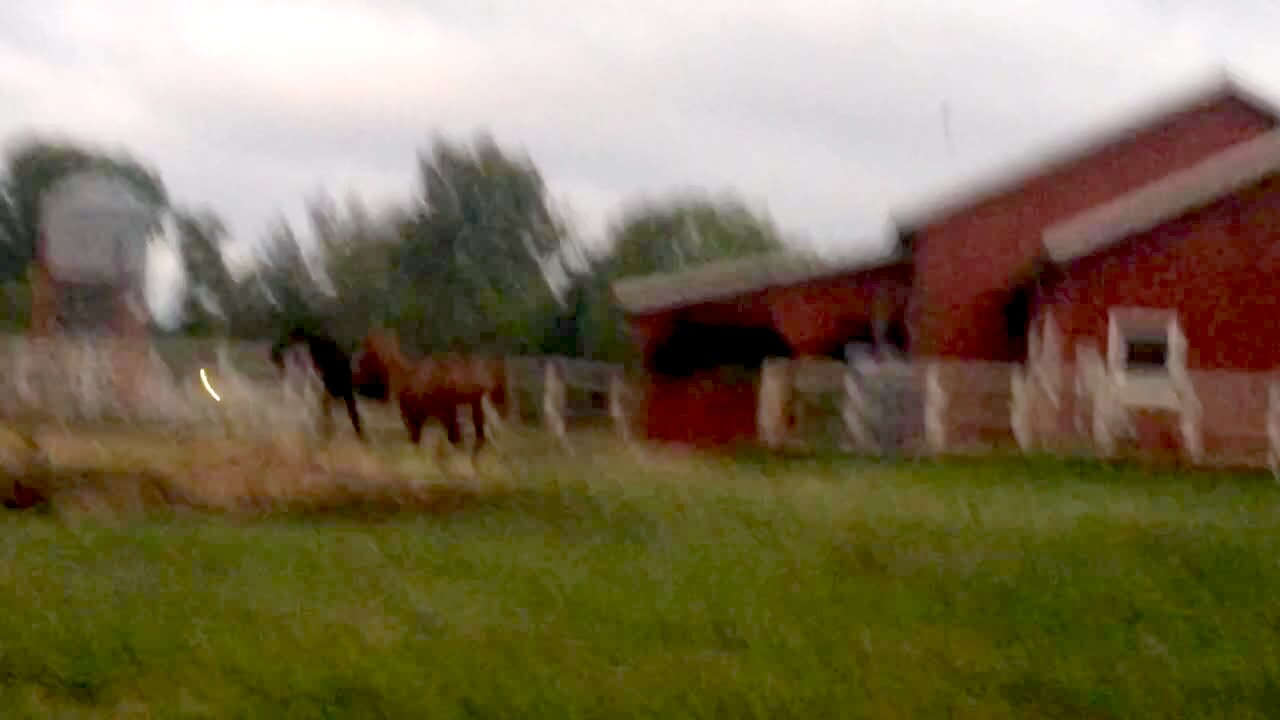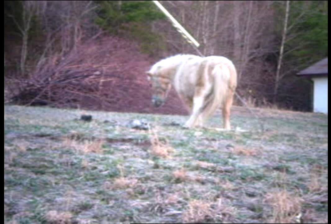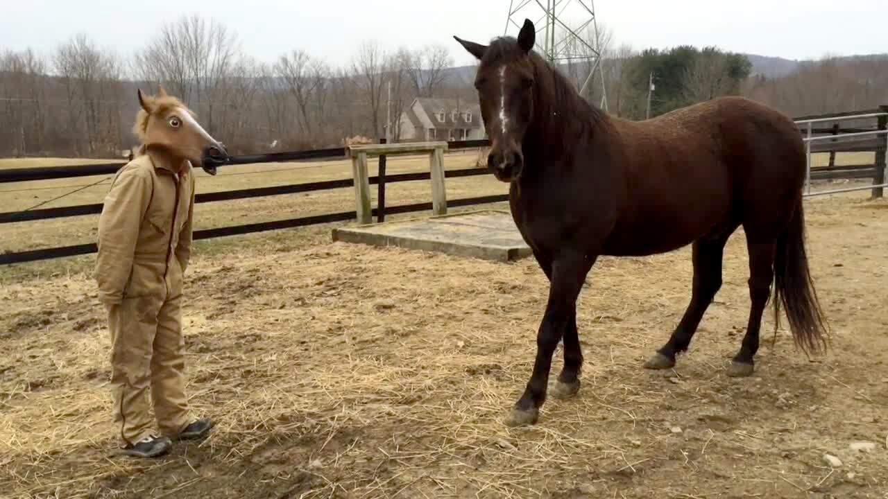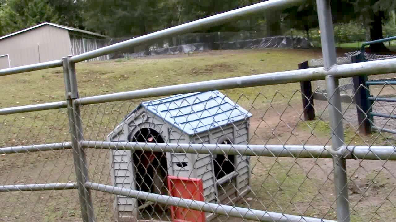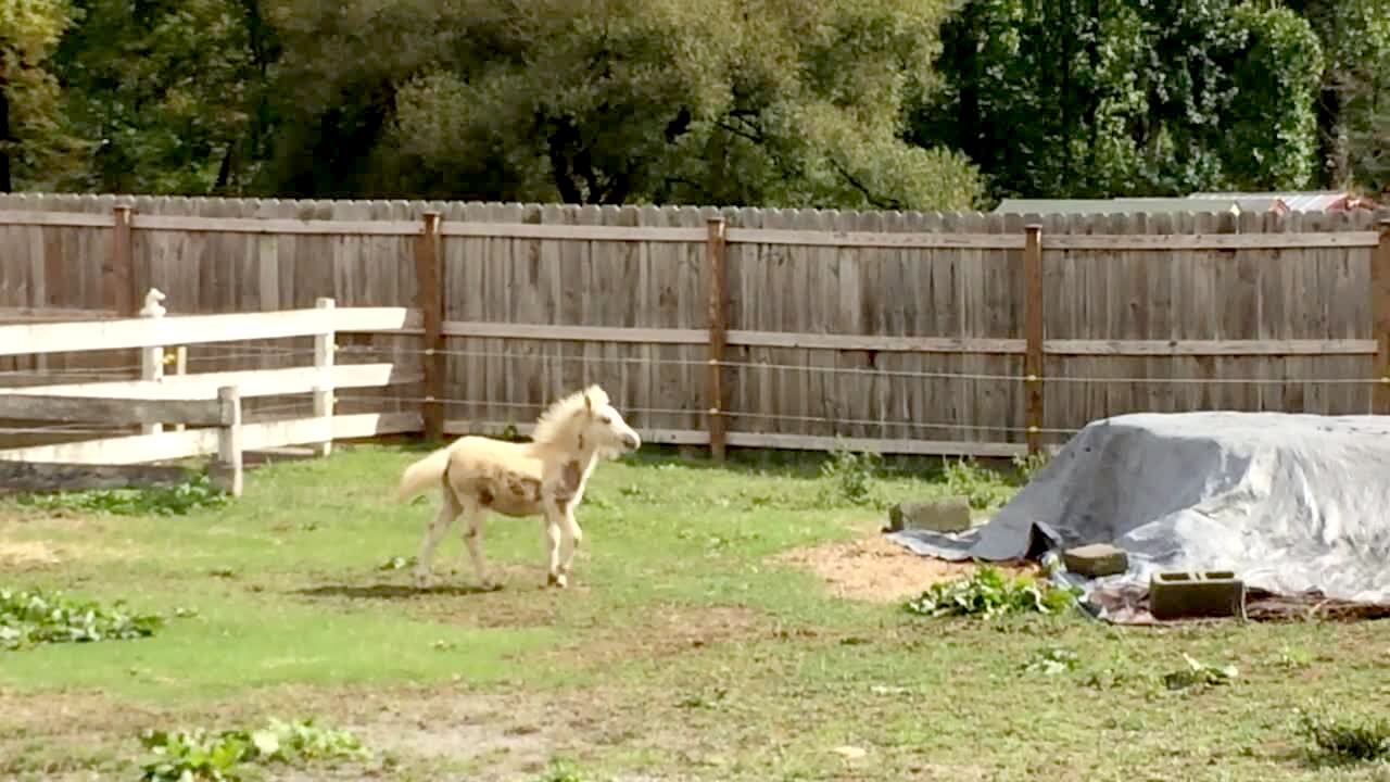 A miniature horse gets stuck in a playhouse outdoors and whenever he walks, the playhouse goes with him.