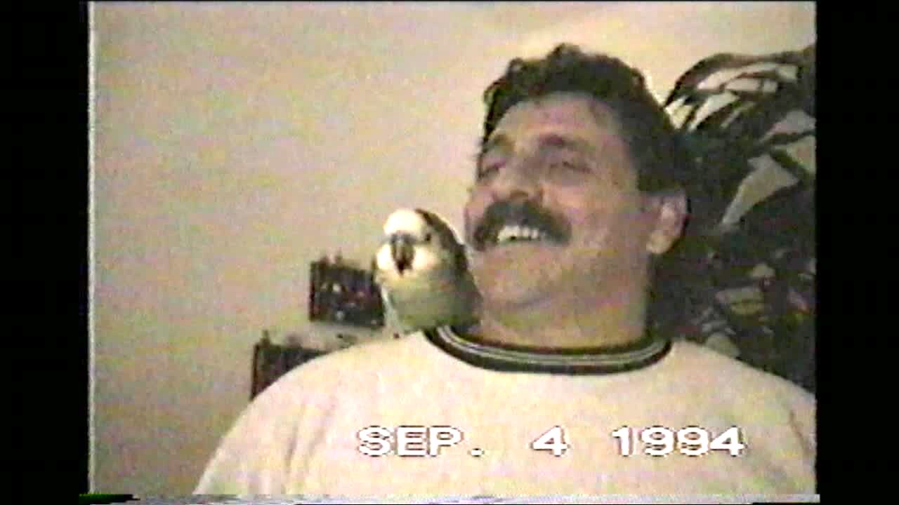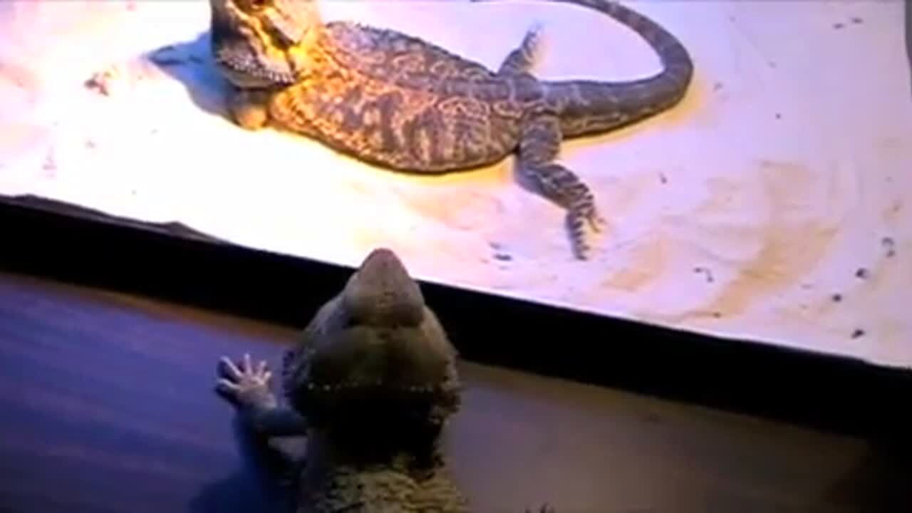 Bearded lizard sits on table & looks at female lizard inside cage and goes crazy hitting his feet on the table.