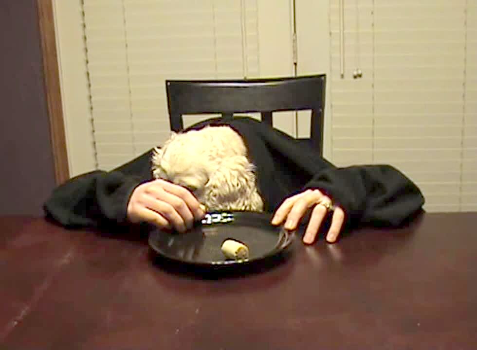 Woman sits at dining room table with her hands through a shirt and dog's head through the neckline. Looks like the Cocker Spaniel is eating with human hands. Long for edit.