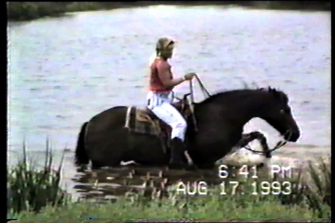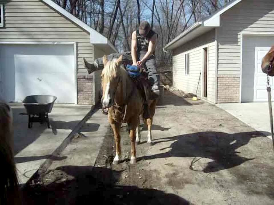 Man jumps on back of horse and then falls on the ground. Black lab dog comes running toward him.