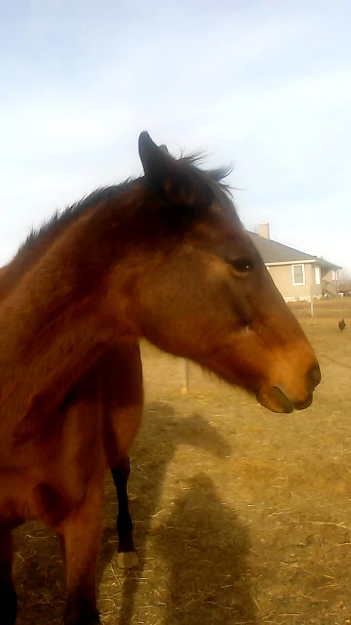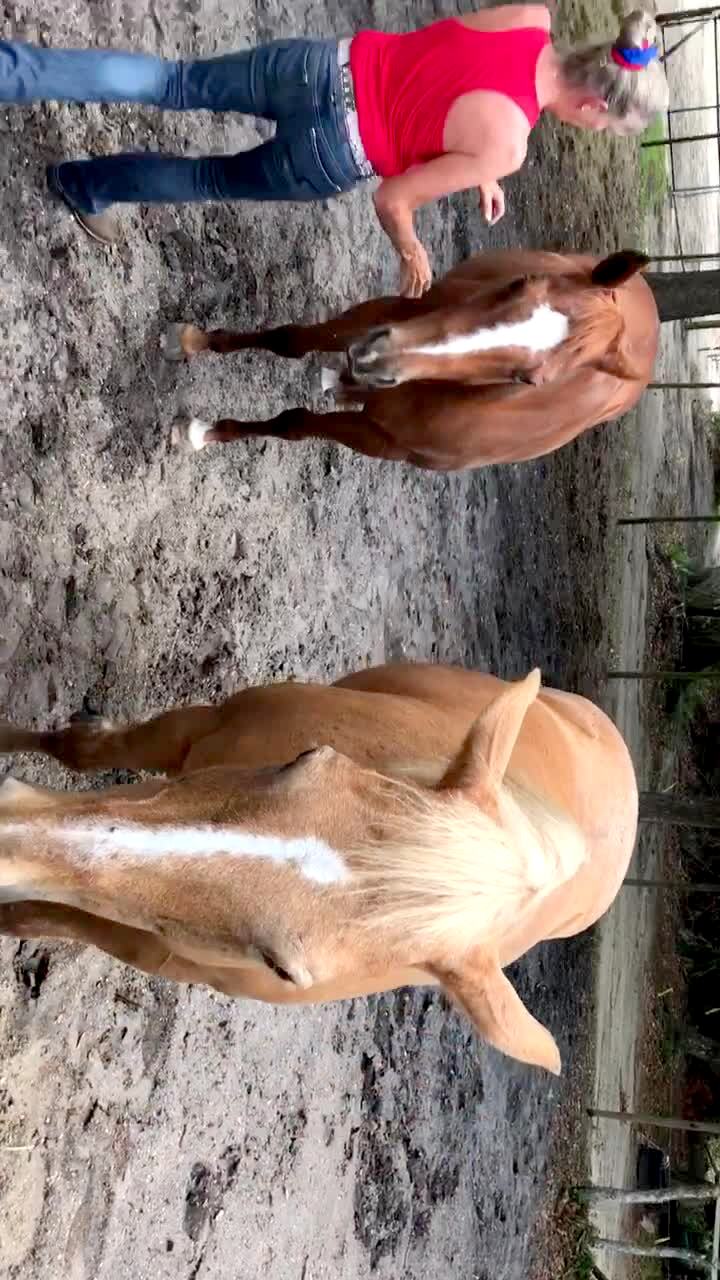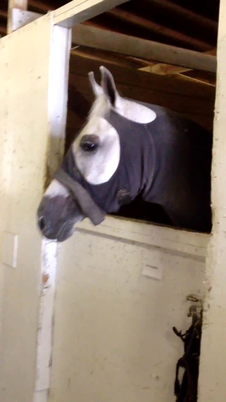 A woman calls her horse to look at the camera as he stands in a stable and he looks at her, nods his head, and jiggles his lips up and down.