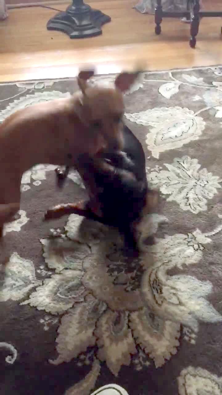 Two dogs wrestle around but then stop and look at the camera when their owner offers them a treat indoors.