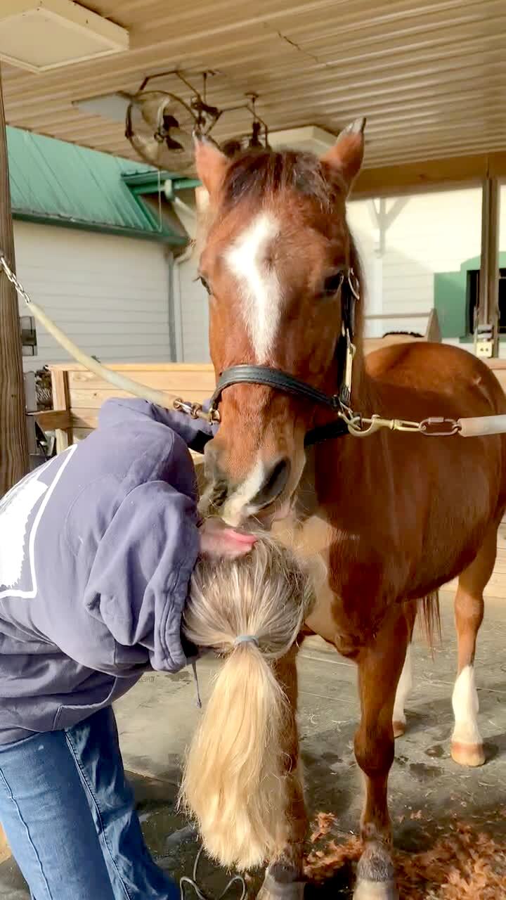 A horse uses his mouth to tickle a young woman's ear at a stable while she tries to cut the horse's hair, and she screams.