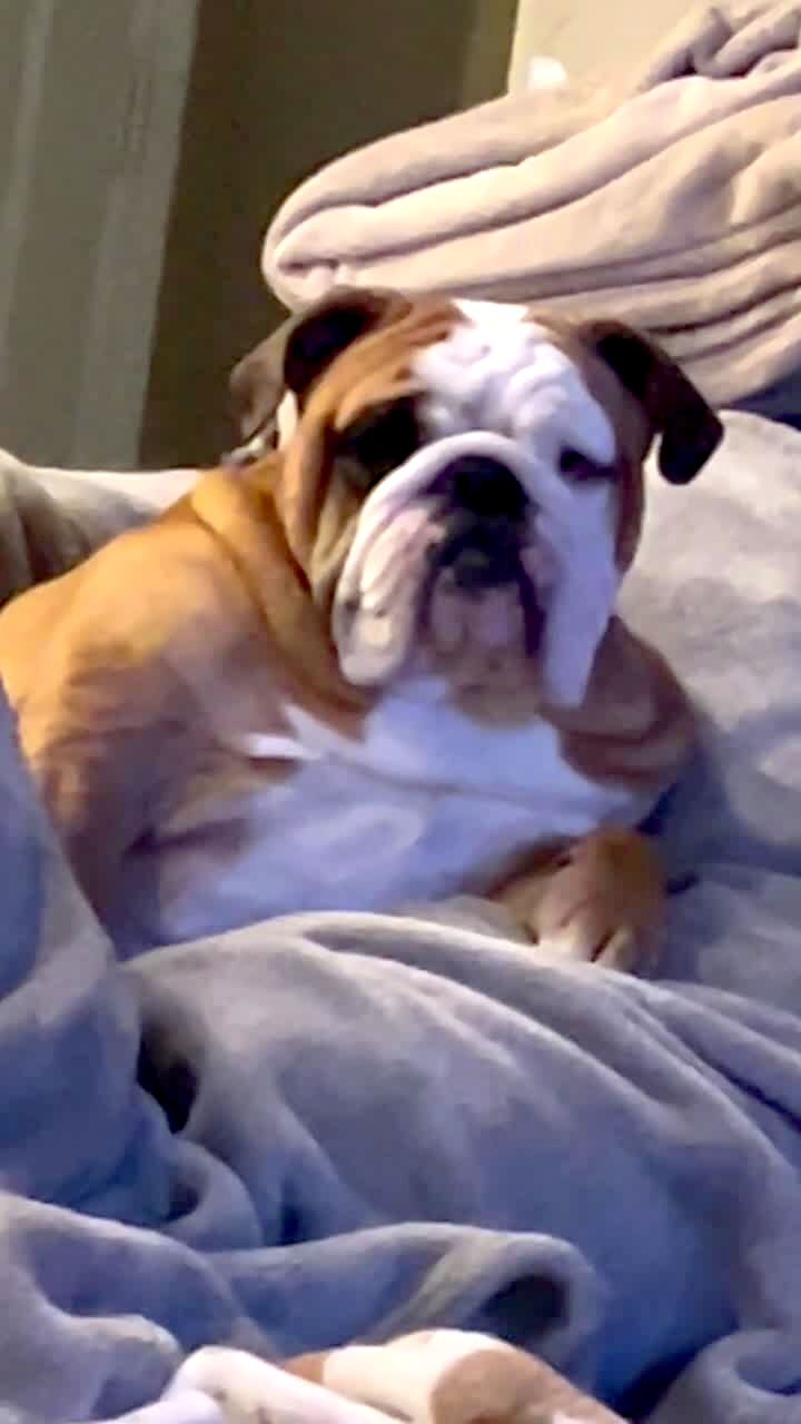 Bulldog rests its head on a chair and makes noises while sleeping. Graphics at beginning of clip.