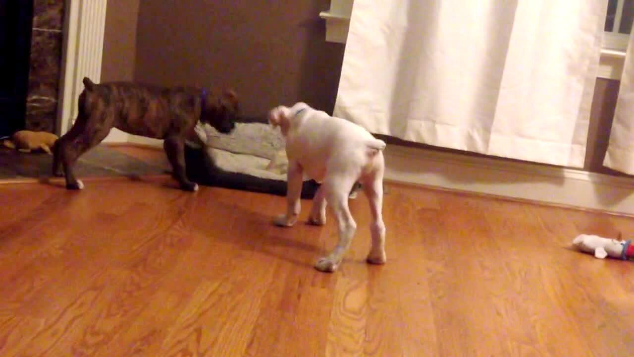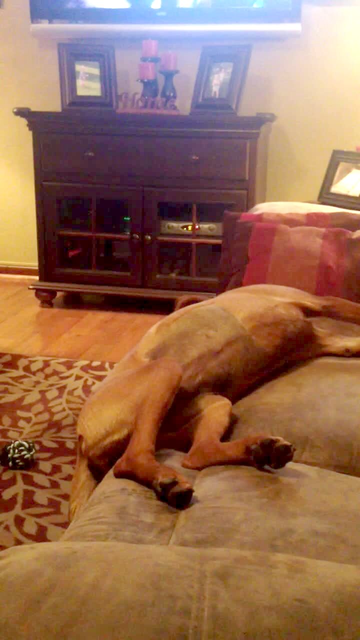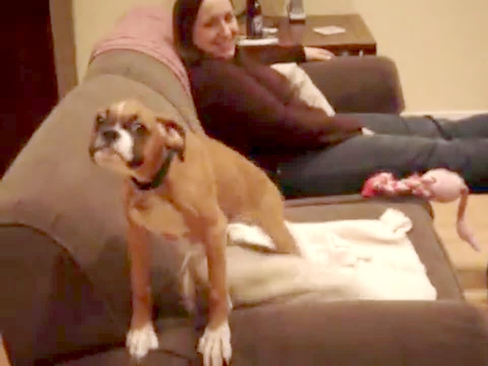 Dad comes home to see Boxer puppy, dog stands on the couch and wags its tail. Dog falls off the couch.