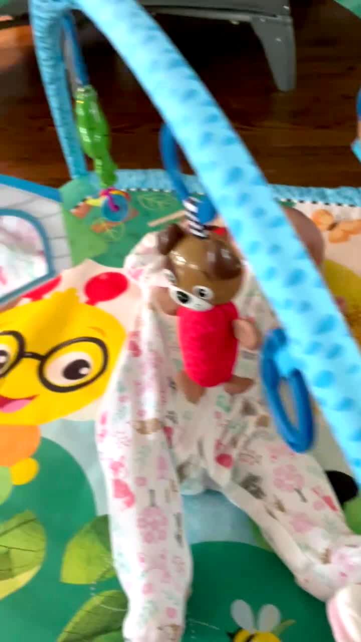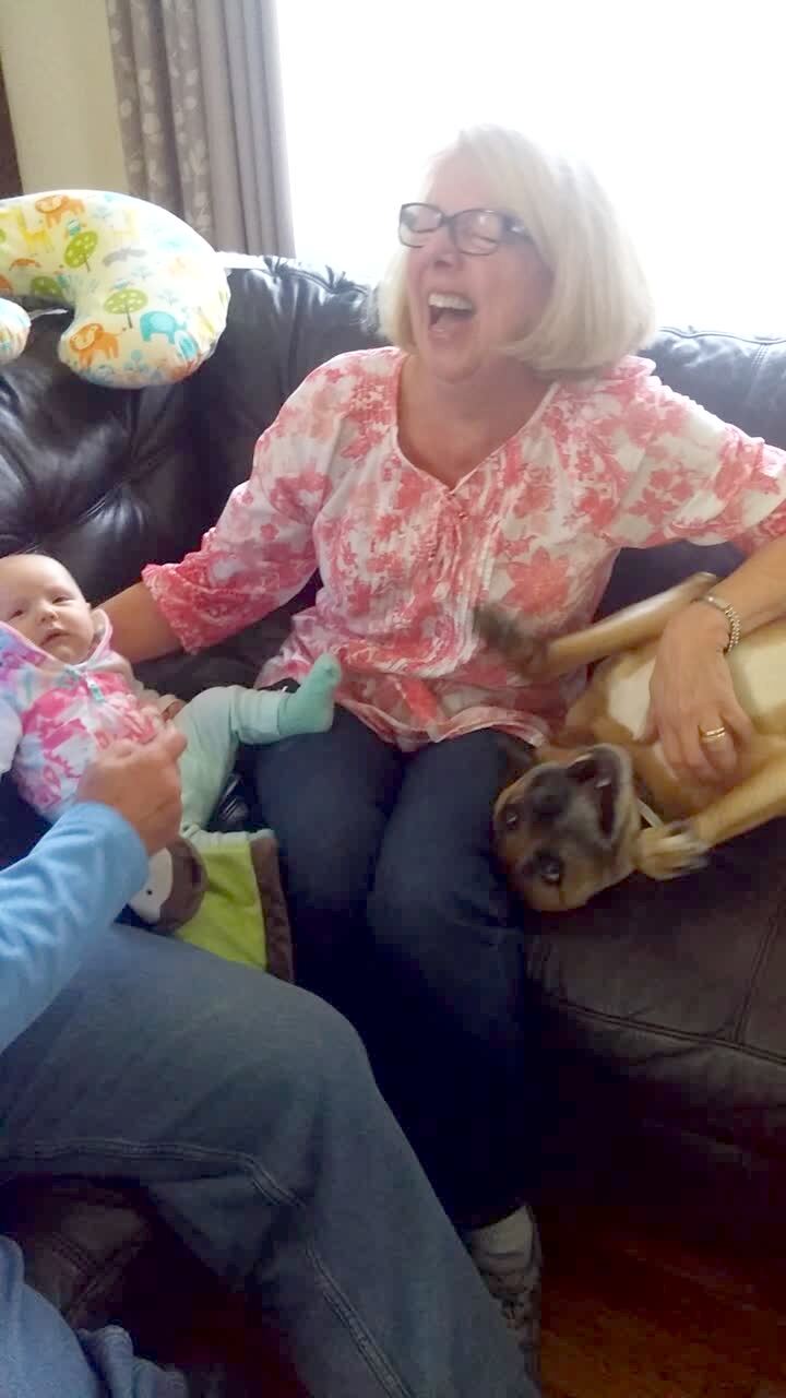 "Possessive Pooch Prevents Pickup" A woman sits on a couch and tries to pick up a baby, but a dog lying on its back next to the woman grabs on to her arm and won't get her.