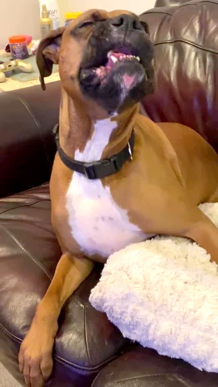 A woman gasps at a dog that lies on a couch. The dog perks up quickly. Gasp at Your Dog Challenge