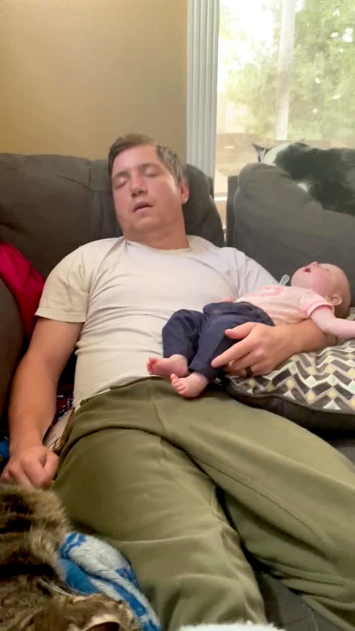 On the living room couch, a man, a baby girl and four dogs are all asleep at the same time.