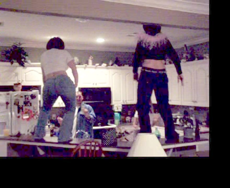 3 drunk women dance sexy on kitchen counter with their backs facing the camera. 1 woman starts to fall off, pulls another down with her. NO TAILS. No recovery.