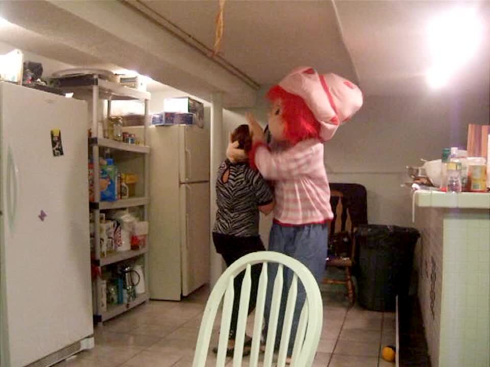 Woman and a person in a Strawberry Shortcake costume dance. They slip and fall down together.