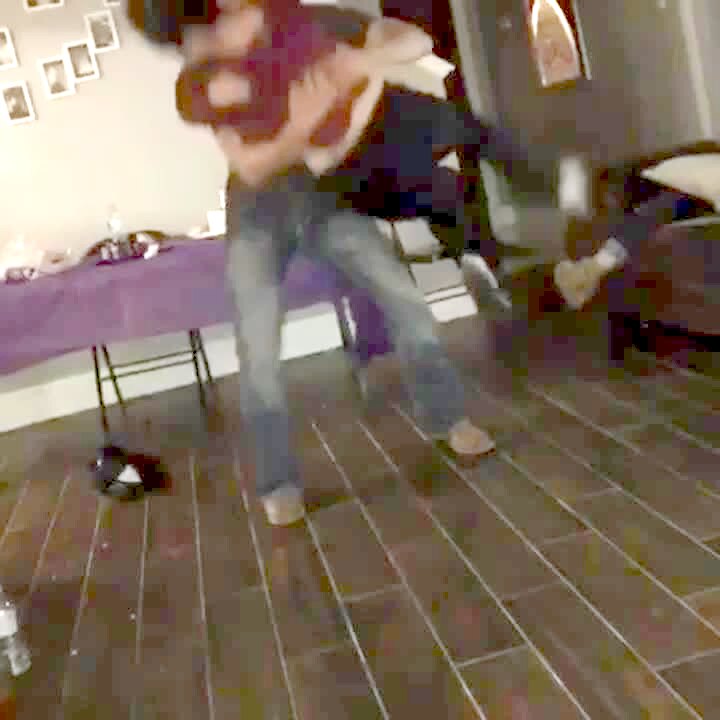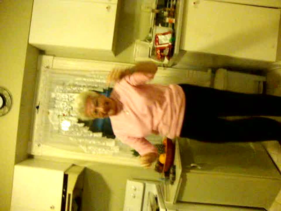 A woman falls on her butt while she dances in a kitchen. Featured talent cleared (the dancing woman). Music rights not cleared.