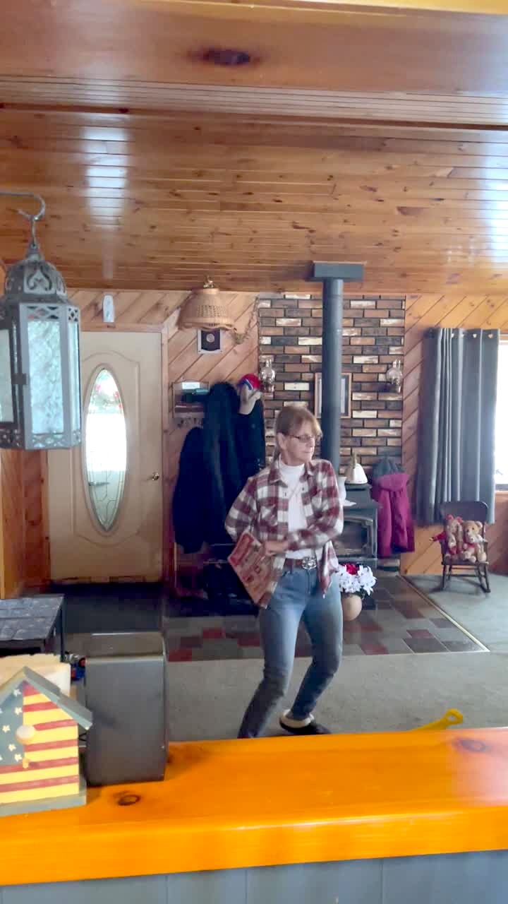 A grandma dances in a living room then loses her balance and face plants after she lets her hair down.