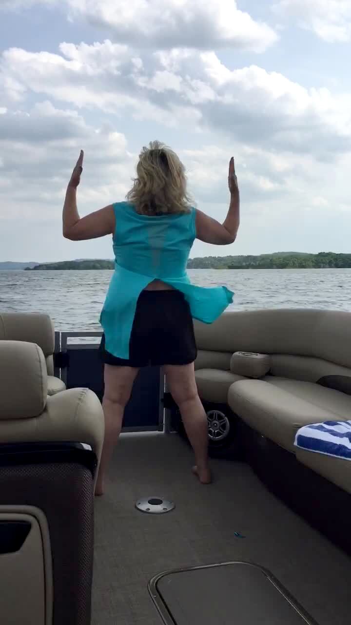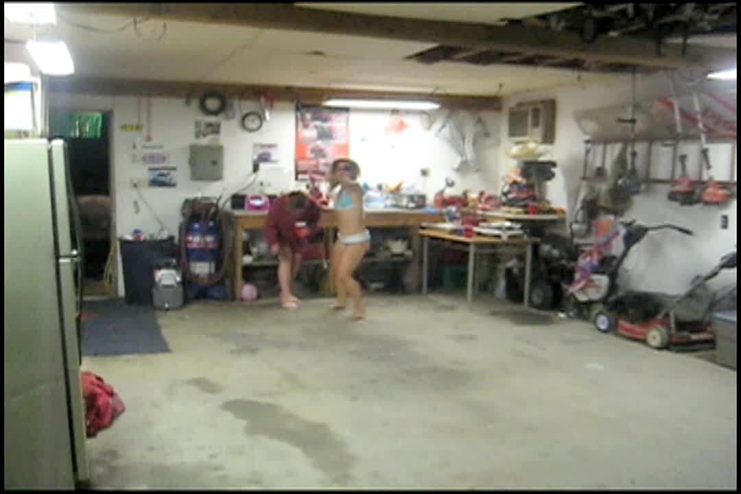 Woman wearing bikini dances in garage to karaoke music, jumps on a cooler / tupperware bin and it tips over. The girl falls on the concrete floor. Song is "Man, I Feel Like a Woman"