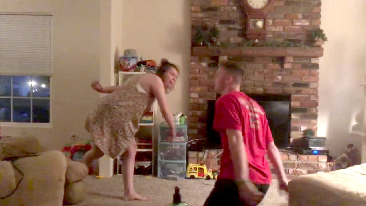 A woman runs and jumps at a man as he lifts her up in the living room to recreate the scene from "Dirty Dancing" and they lean too far back and he drops her.