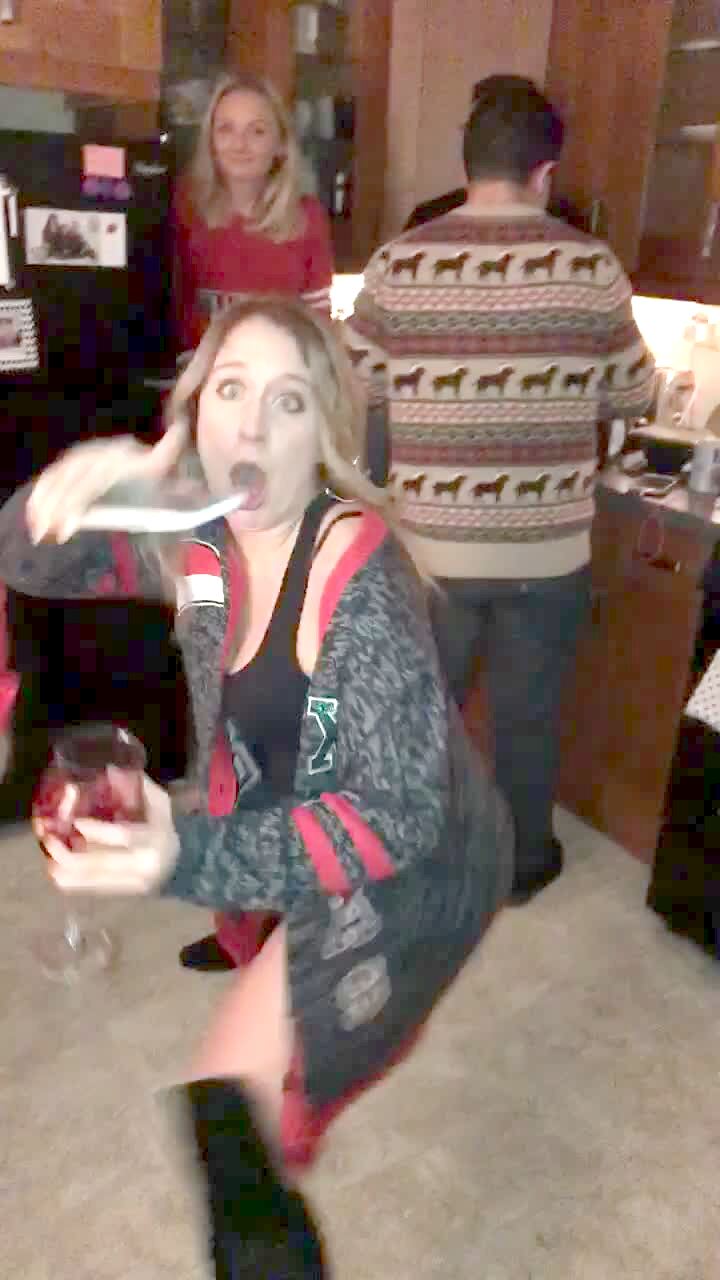 A woman dances on a table at a party and falls off of the table. Drunk?