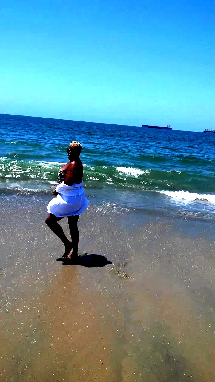 A woman dances outdoors at a beach in the surf, then falls over into the water.