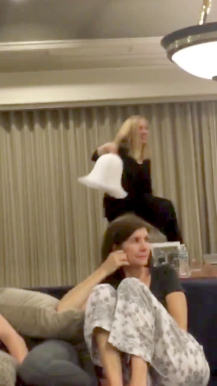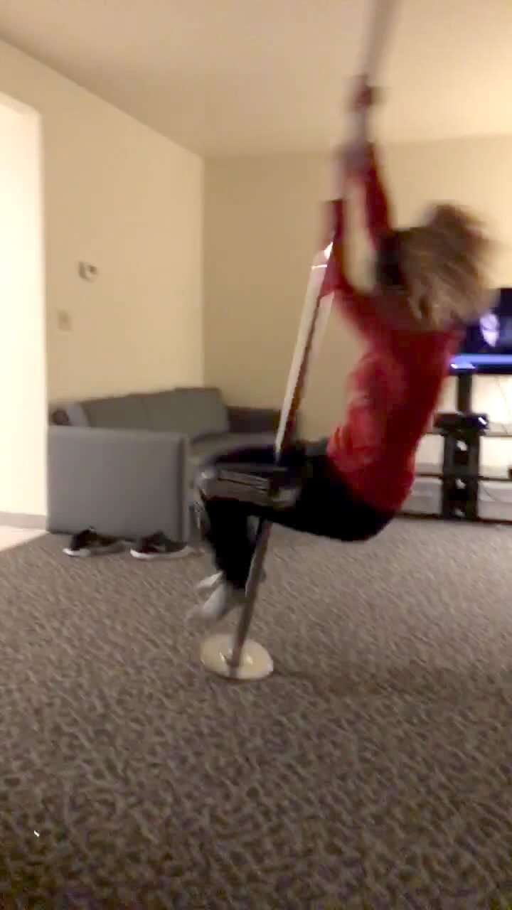 A woman dances on a stripper pole at home, but the pole comes down, and she falls.