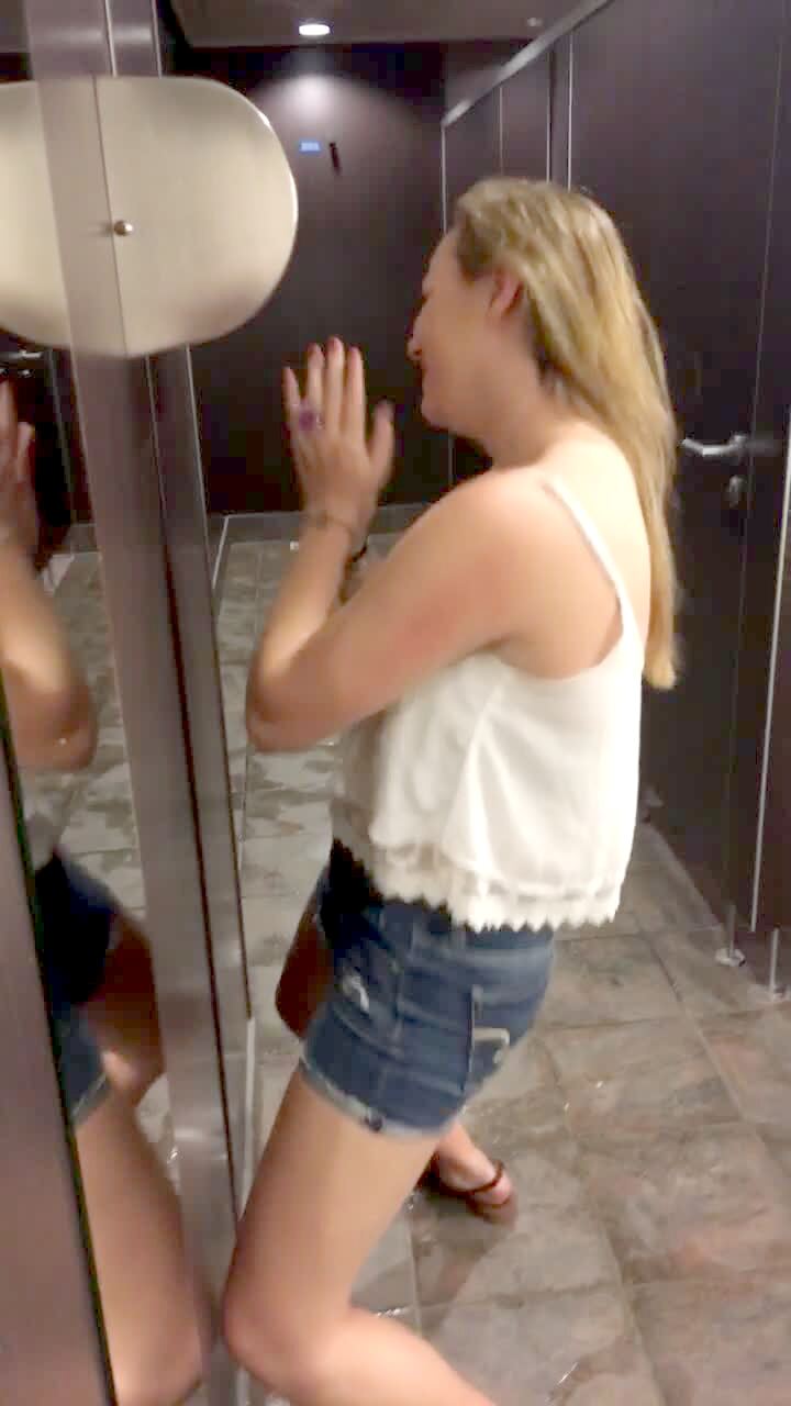 A young woman dances while she uses an air dryer in a public bathroom and then she slips and falls. Short tail