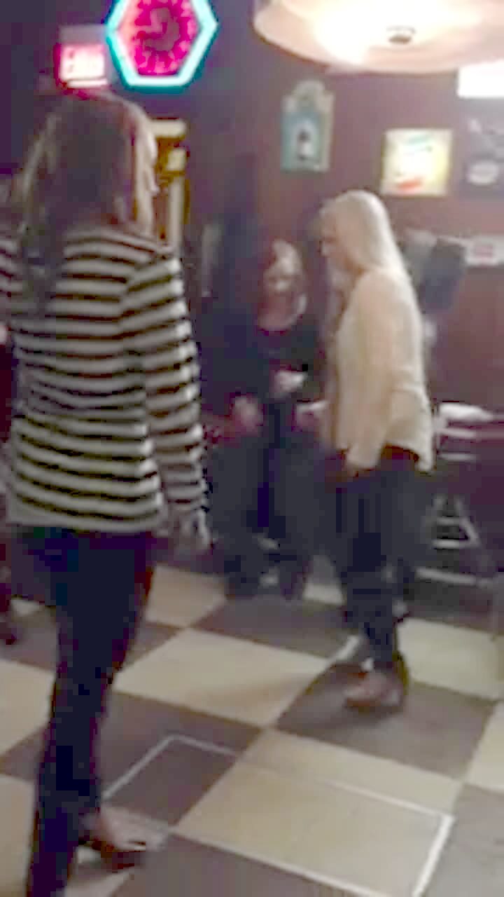 A young woman or teen girl dances and falls in a bar. Four other teen girls or woman are visible.