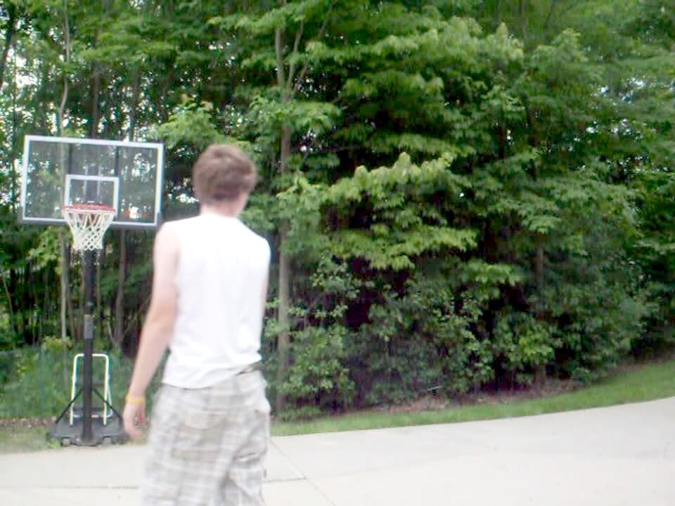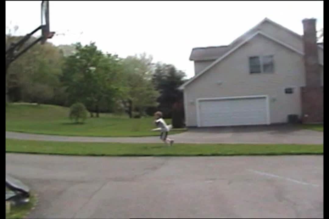 Teen boy dunks on basketball goal in driveway, goal collapses, boy falls in yard.