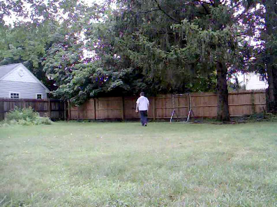 Teen boy tries to make a 30 foot shot into basketball hoop and he breaks the garage lamp.