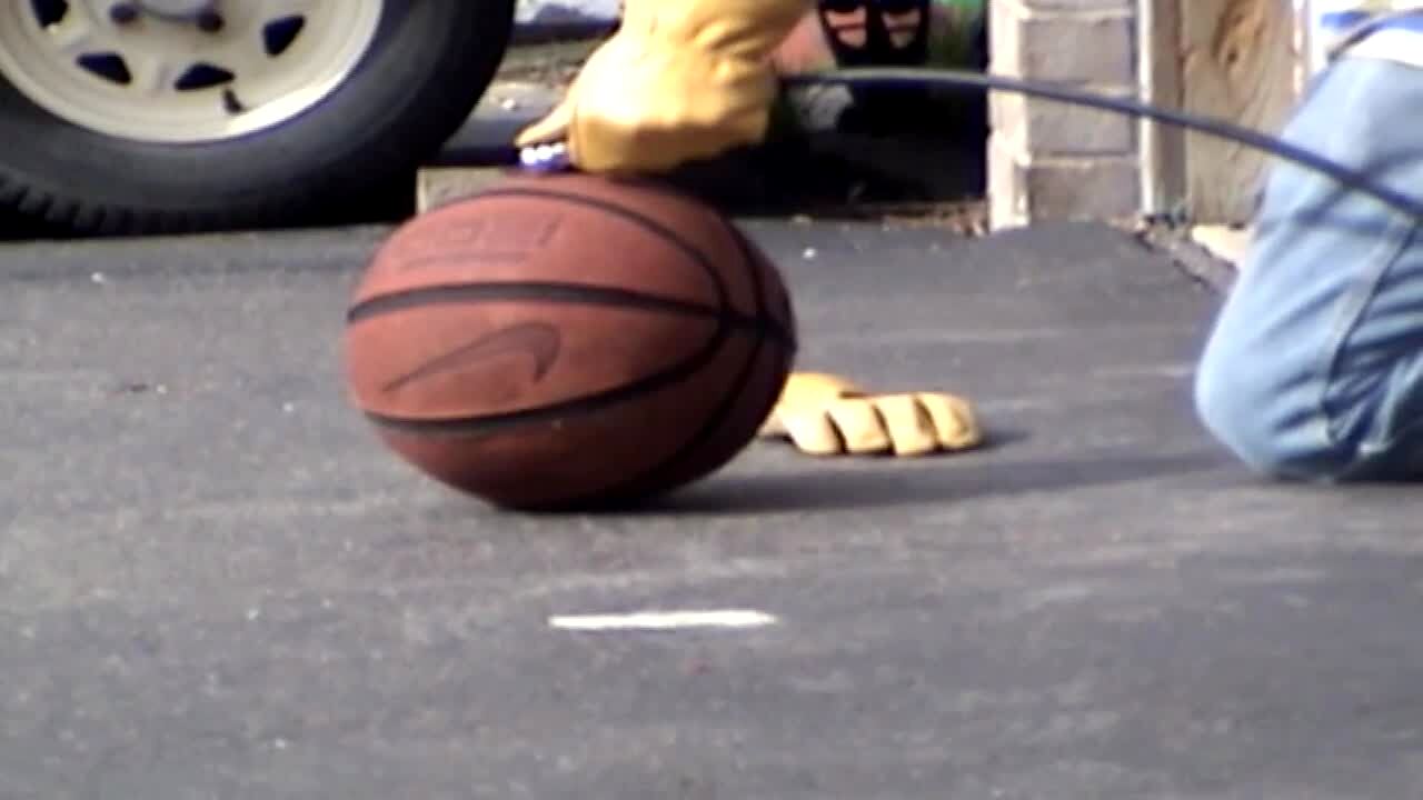 Man inflates a basketball very full of air. He bounces it several times and it explodes. Long for edit.