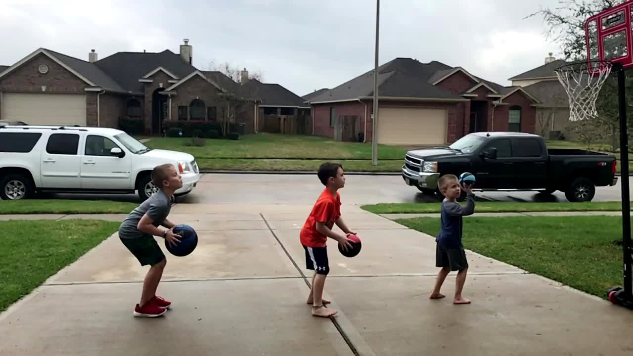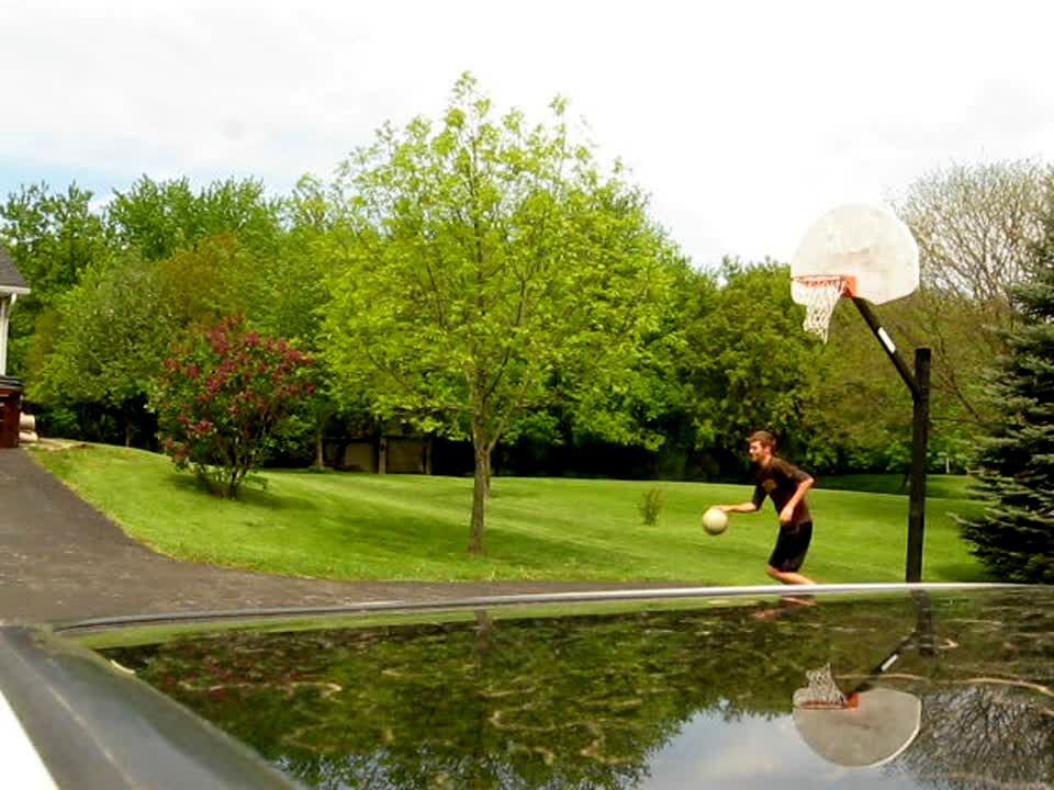 Boy holds a trampoline in the driveway, another boy bounces a basketball on it. The ball flies over his head & goes into the hoop far behind him in the backyard. Amazing shot.