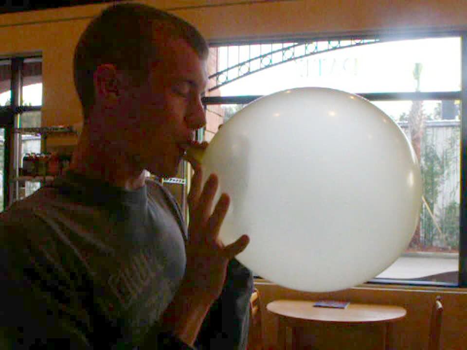 A teen boy blows up a balloon huge at a coffee shop. The balloon pops/explodes and he screams. Short tails. Restaurant.