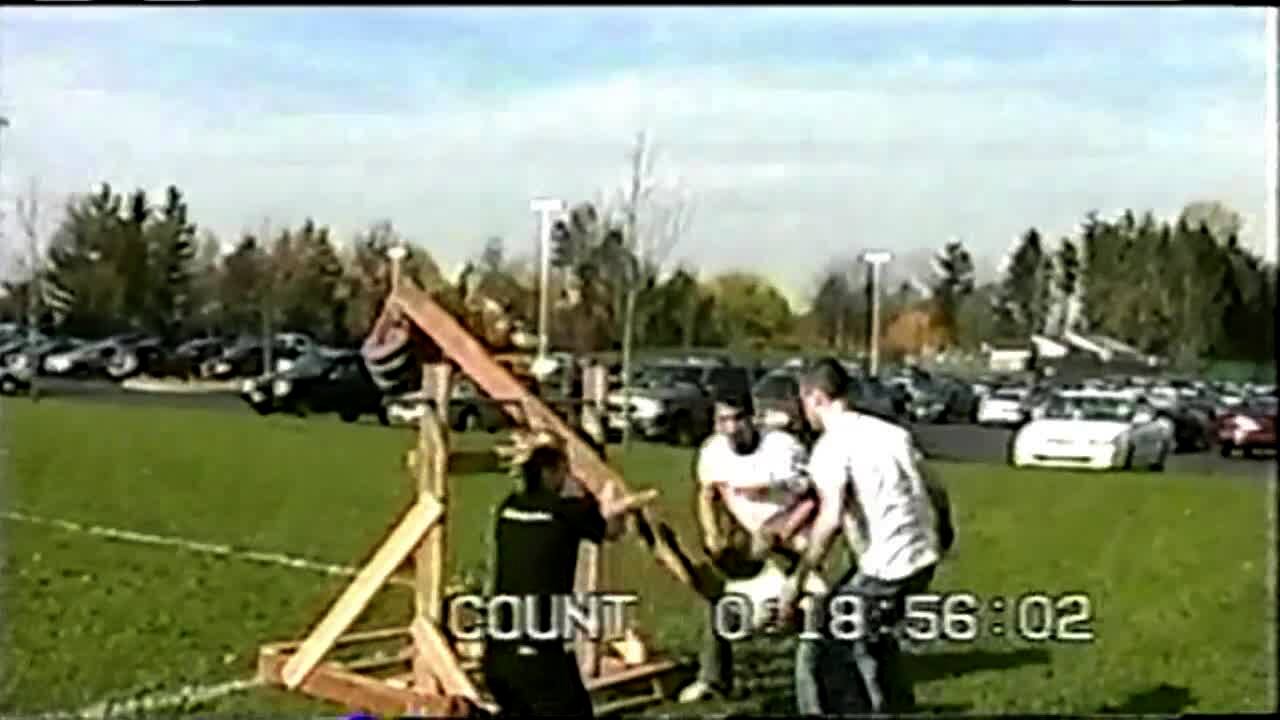 On a grassy field by a high school, 3 boys try to launch a ball with a catapult. It misfires and the ball hits one boy on the head. Trebuchet was built for physics class. Music over clip, short heads & tails.