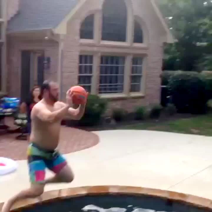 A group of teen boys do a basketball trick shot where one boy throws it across the yard to other boys at a pool who catch it and pass it to each other and the last boy shoots it into the hoop in slow motion.